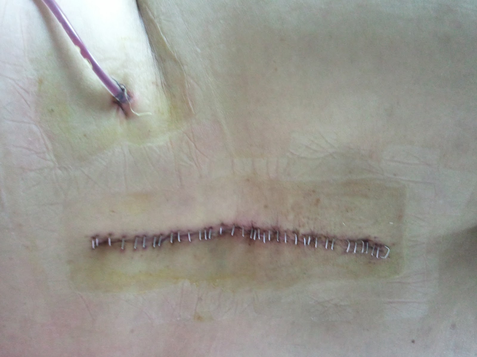 【後背快靠近腰部的脊椎開刀後第5天換藥時傷口樣子,左上方那條管子是血水引流管】